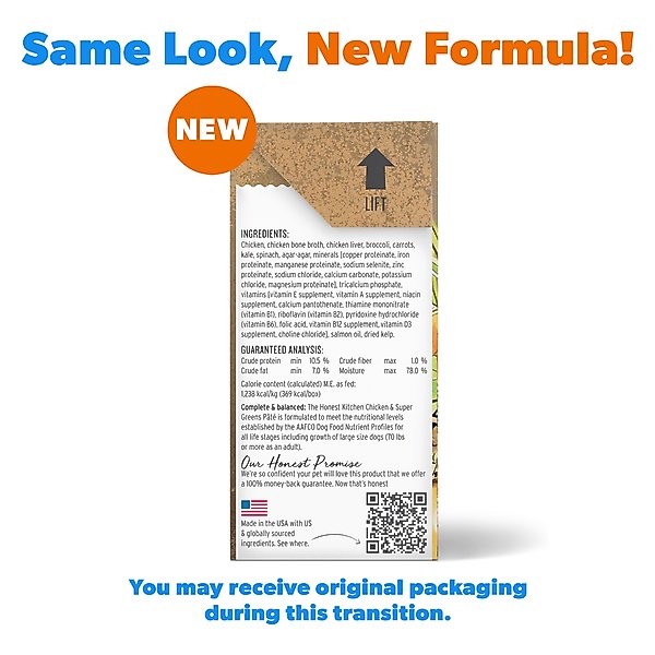 The Honest Kitchen Butcher Block Pate Chicken & Super Greens Pate Wet Dog Food is a doggone easy way to keep your furry friend nourished! Made with cage-free chicken and farm-grown veggies such as carrots and green beans, this hearty wet food can help keep your canine companion happy and healthy. Mix it in with your pup’s regular breakfast, lunch, or dinner—or serve it as a complete meal. With human-grade ingredients made in a human food facility, the quality of the ingredients holds up and offers a balanced diet for your precious pooch.