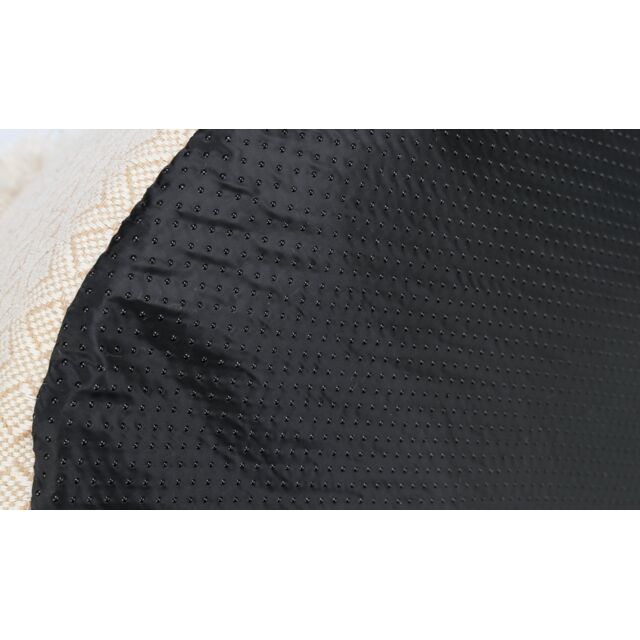 The cave is made of woven fabric/plush and has a cotton jute/polyester cover. The cave is foam-padded, making it extra soft for your cat. The non-slip bottom ensures the cave stays put and the cushion is removable.